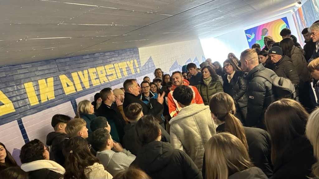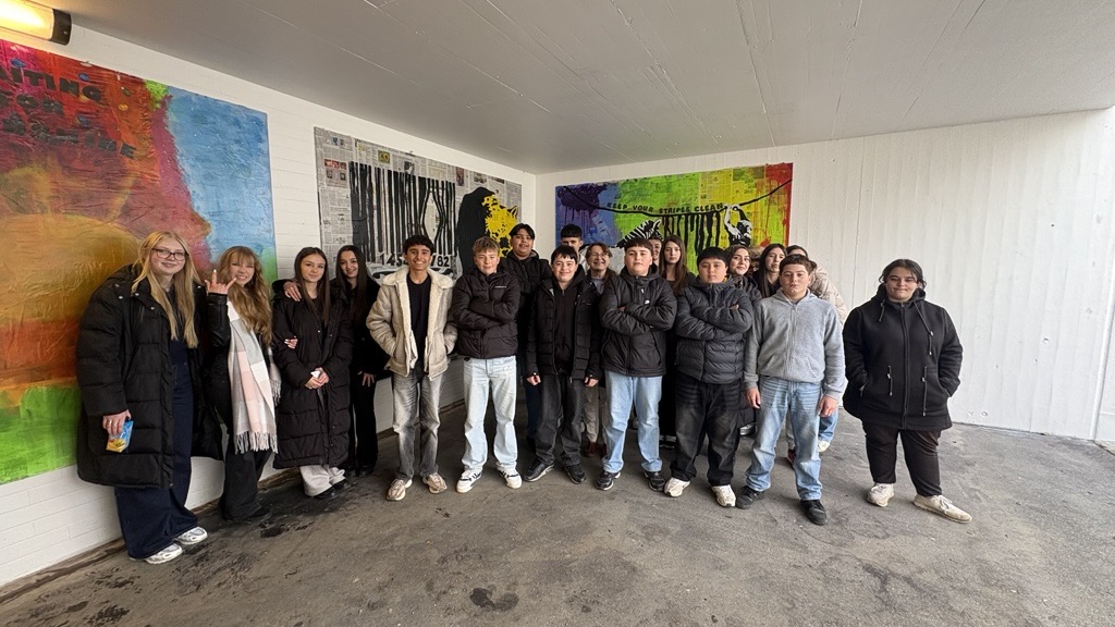 Am Donnerstag, den 27.11.25, war zur feierlichen Einweihung der Kunstwerke an der Unterführung des Schulzentrums (Richtung Bushaltestellen und Halfpipe) Herr Bürgermeister, Richard Arnold, zu Besuch. Es waren alle beteiligten Schüler und Lehrer vor Ort und konnten diesem Besuch beiwohnen.
