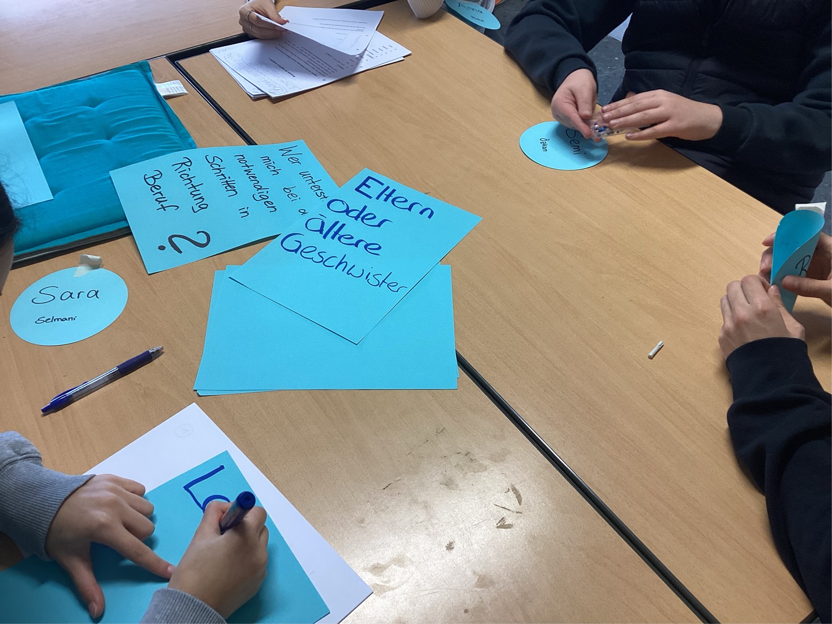 Ein weiterer Schwerpunkt lag auf der Recherchearbeit: Auf der Plattform „Berufenet“ informierten sich die Jugendlichen über Ausbildungswege, Anforderungen und Zukunftsperspektiven verschiedener Berufe. Die Ergebnisse hielten sie in selbst erstellten Steckbriefen fest – prägnant, übersichtlich und individuell gestaltet. In einer anschließenden Gruppenarbeitsphase wurden typische Fragen aus Bewerbungsgesprächen gesammelt, diskutiert und präsentiert, sodass die Klasse einen umfassenden Überblick über Erwartungen und Kommunikationssituationen im Bewerbungsprozess erhielt.