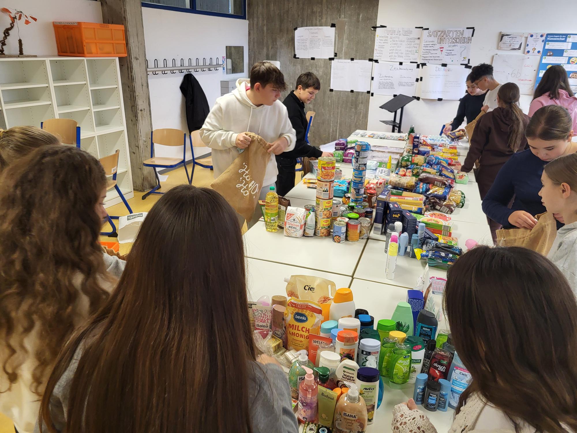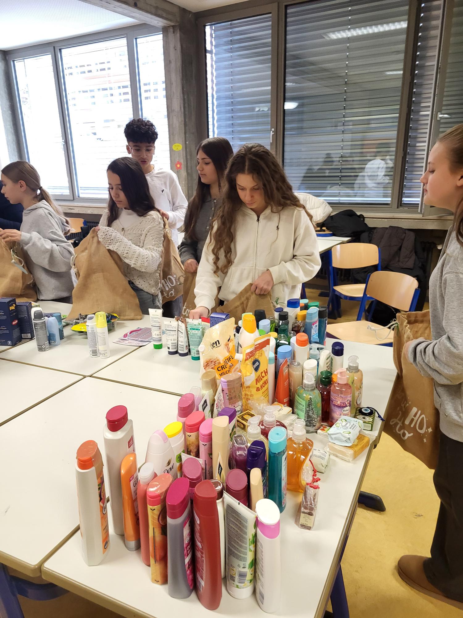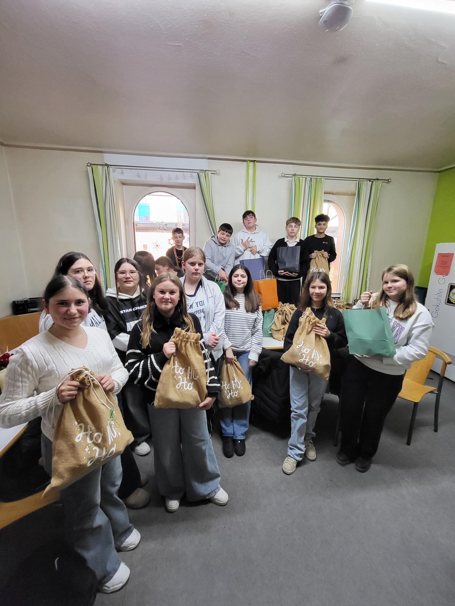 Spendenübergabe des Schulseelsorgeprojekts "Damit wohnungslos nicht hoffnungslos ist "im Obdachlosenwohnheim St.Elisabeth der Caritas in Schwäbisch Gmünd.Die Schülerinnen und Schüler der 7c und der anderen 7er-Klassen haben gemeinsam mit ihren Lehrerinnen Frau Rieger und Frau Volkmann sowie den Schulsoziarbeiterinnen Frau Winkler und Frau Kostrowski 60 Geschenktüten der Schulsammelaktion sowie 1070€ des Spendenerlöses vom Adventskonzert der ASR übergeben.